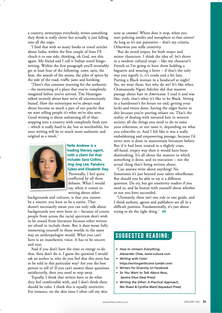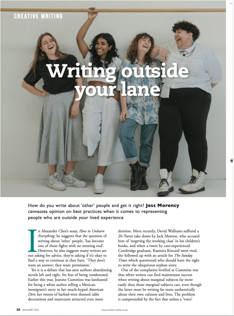 #OwnVoices – Feature for Writing Magazine Posted byJess MorencyDecember 7, 2020January 2, 2021Posted inWriting MagazineTags:#ownvoices, alexander chee, cynthia ward, helen hoang, ijeoma oluo, monisha rajesh, nelle andrew, Nikesh Shukla, nisi shawl, Rethink Report, tracy chevalier, Uju Asika, writing outside your lane, writing the other Share this: Share on X (Opens in new window) X Share on Facebook (Opens in new window) Facebook Like Loading... Related Published by Jess Morency Feature writer, teacher and brand consultant View more posts