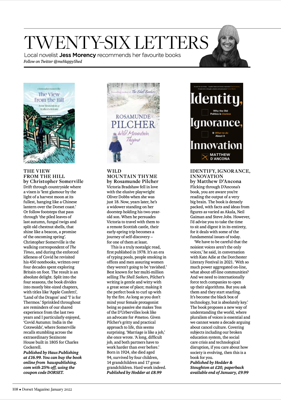 Twenty Six Letters: January 2022 Posted byJess MorencyDecember 27, 2021October 25, 2022Posted inbook reviews, Dorset MagazineTags:book review, christopher somerville, dorset magazine, elif shafak, john boyne, monthly column, nadine matheson, rosamunde pilcher, tortoise media Share this: Click to share on X (Opens in new window) X Click to share on Facebook (Opens in new window) Facebook Like Loading... Related Published by Jess Morency Feature writer, teacher and brand consultant View more posts
