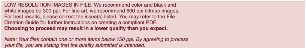 My designer said that the upload process doesn’t like type under a certain size being coloured. Printed, the cover looks fine.