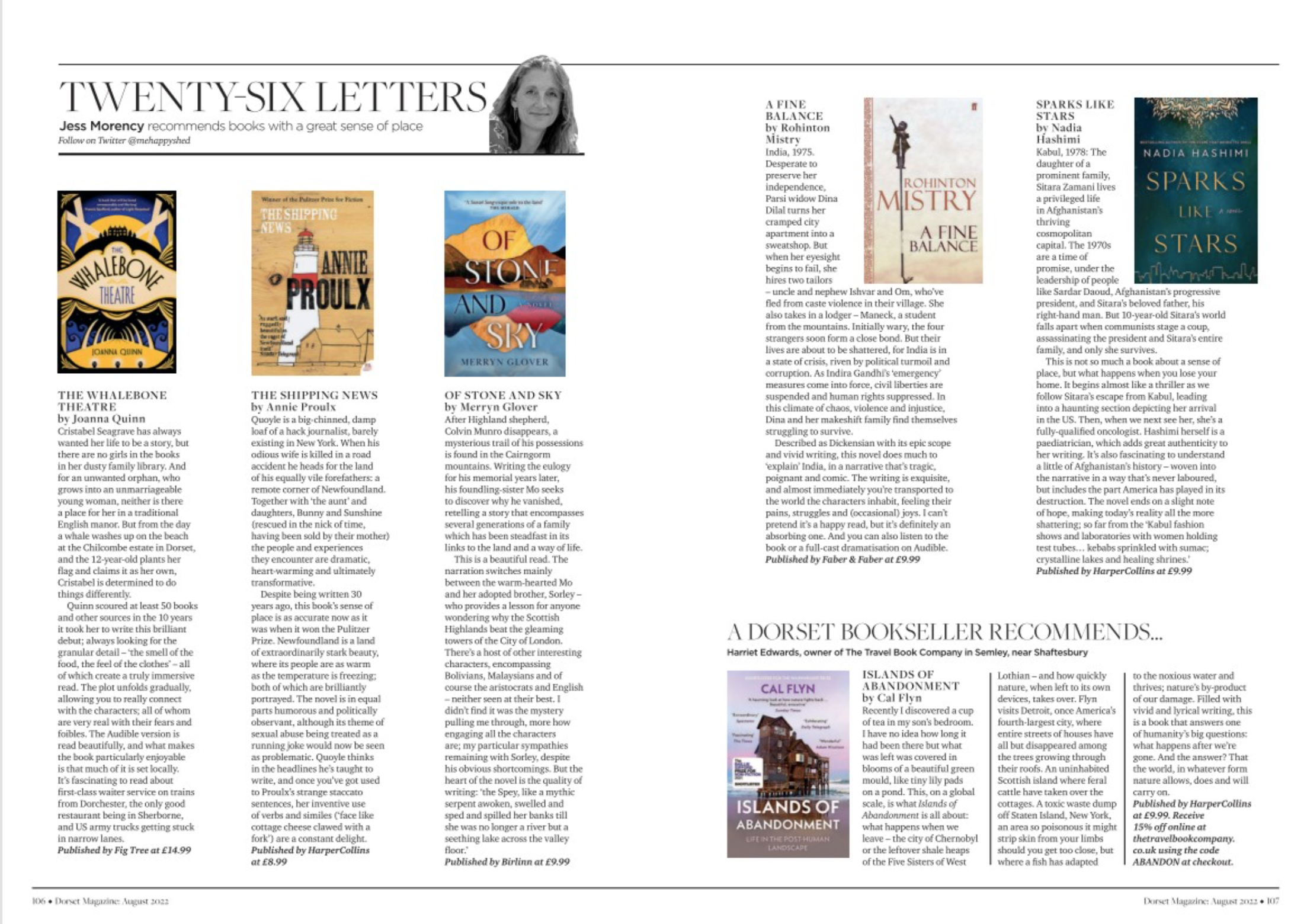 Twenty-six Letters : August Posted byJess MorencyJuly 25, 2022October 25, 2022Posted inbook reviews, Dorset MagazineTags:A Fine Balance, Annie Proulx, cal flyn, Dorset in the war, Islands of Abandonment, Joanna Quinn, kabul, Merryn Glover, Nadia Hashimi, Of Stone and Sky, Rohinton Mistry, sense of place, Sparks like Stars, The Whalebone Theatre, writing with a sense of place Share this: Click to share on X (Opens in new window) X Click to share on Facebook (Opens in new window) Facebook Like Loading... Related Published by Jess Morency Feature writer, teacher and brand consultant View more posts