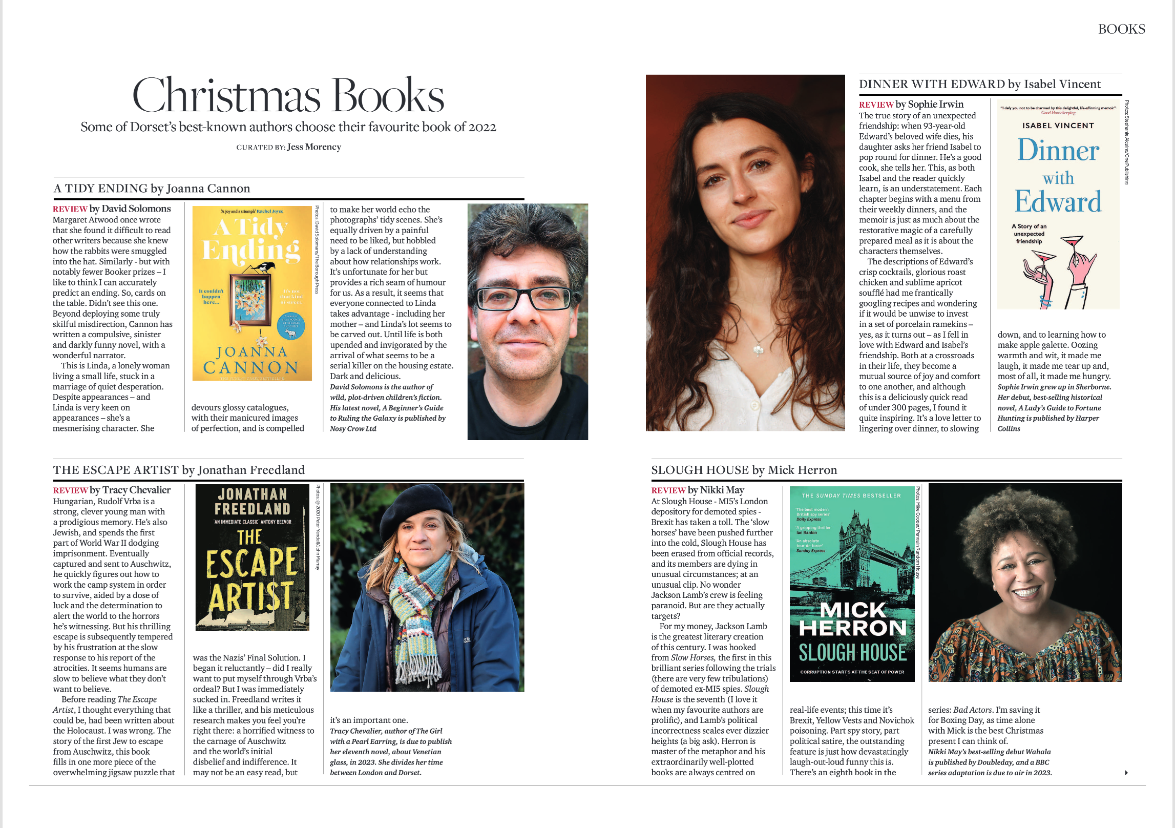 Twenty-six Letters: December 2022 Posted byJess MorencyNovember 28, 2022Posted inbook reviews, Dorset MagazineTags:a tidy ending, best books of 2022, david burnett, david solomons, dinner with edward, dovecote press, hilary mantel, Joanna Quinn, Julian Fellowes, kiss myself goodbye, mick herron, nikki may, Sophie Irwin, the bee keeper of aleppo, the escape artist, the place-names of dorset, tracy chevalier Share this: Click to share on X (Opens in new window) X Click to share on Facebook (Opens in new window) Facebook Like Loading... Related Published by Jess Morency Feature writer, teacher and brand consultant View more posts