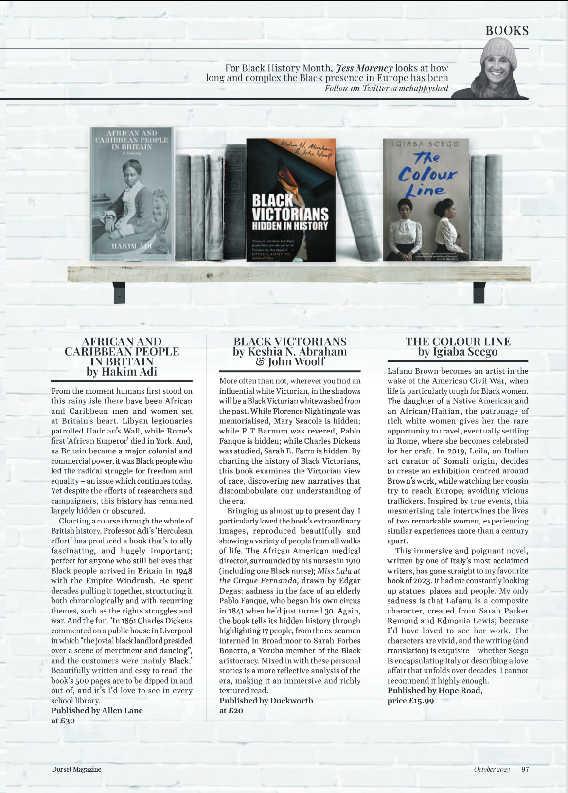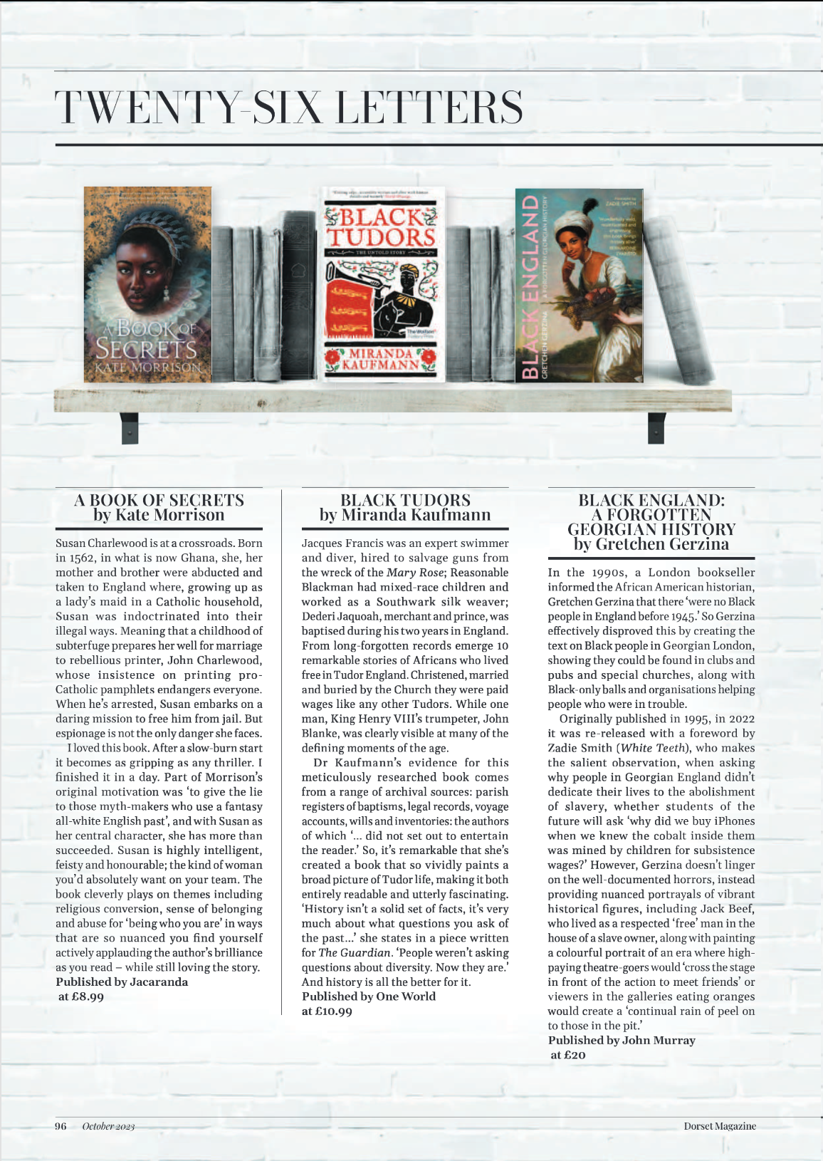 Twenty-six Letters: October Posted byJess MorencySeptember 24, 2023September 24, 2023Posted inbook reviews, Dorset MagazineTags:a book of secrets, black england, black history month, black victorians, gretchen gerzina, hakim adi, hope road publishing, igiaba scego, kate morrison, keshia n. Abraham, miranda kaufman, the colour line, tudor britain Share this: Click to share on X (Opens in new window) X Click to share on Facebook (Opens in new window) Facebook Like Loading... Related Published by Jess Morency Feature writer, teacher and brand consultant View more posts