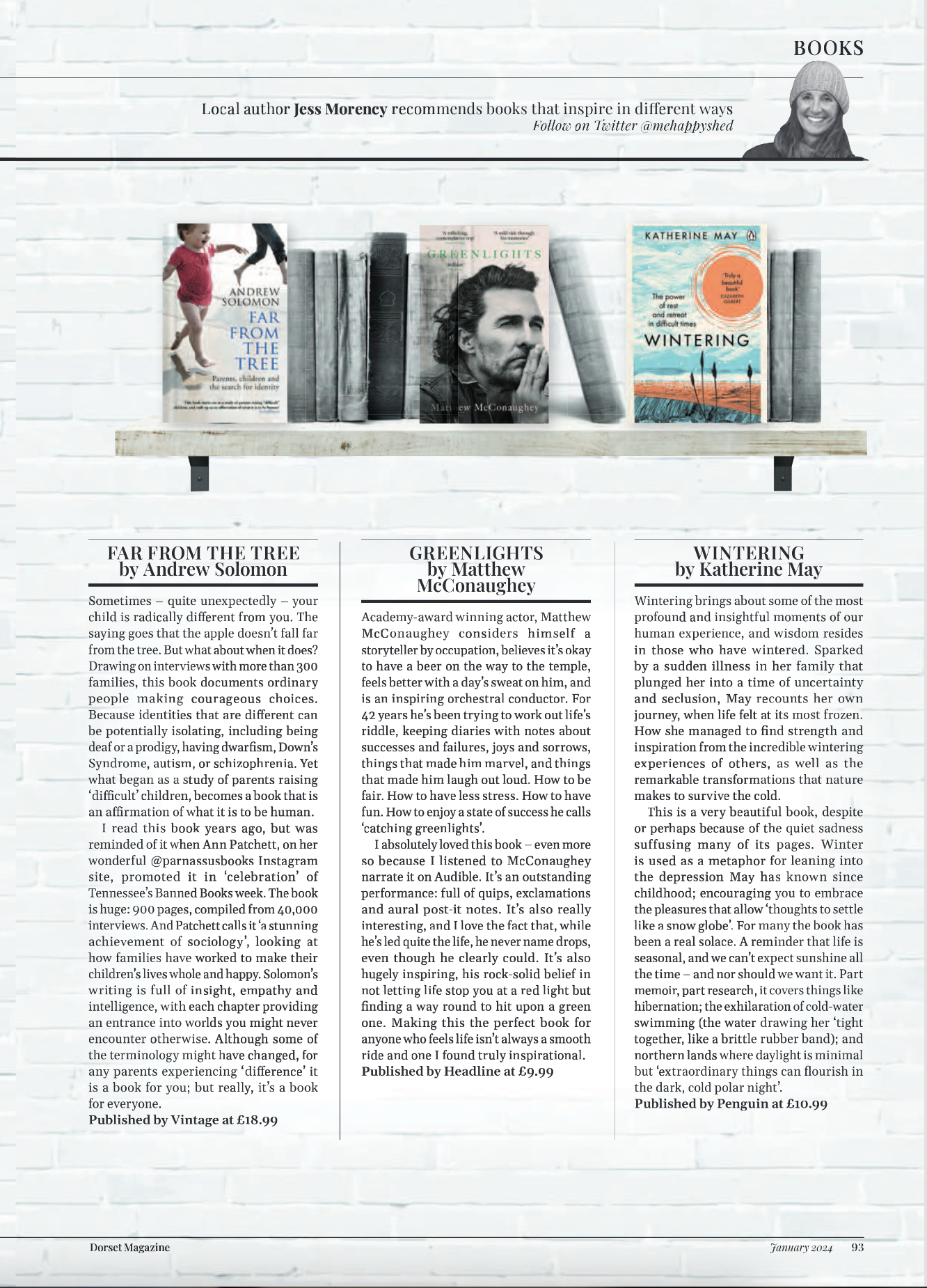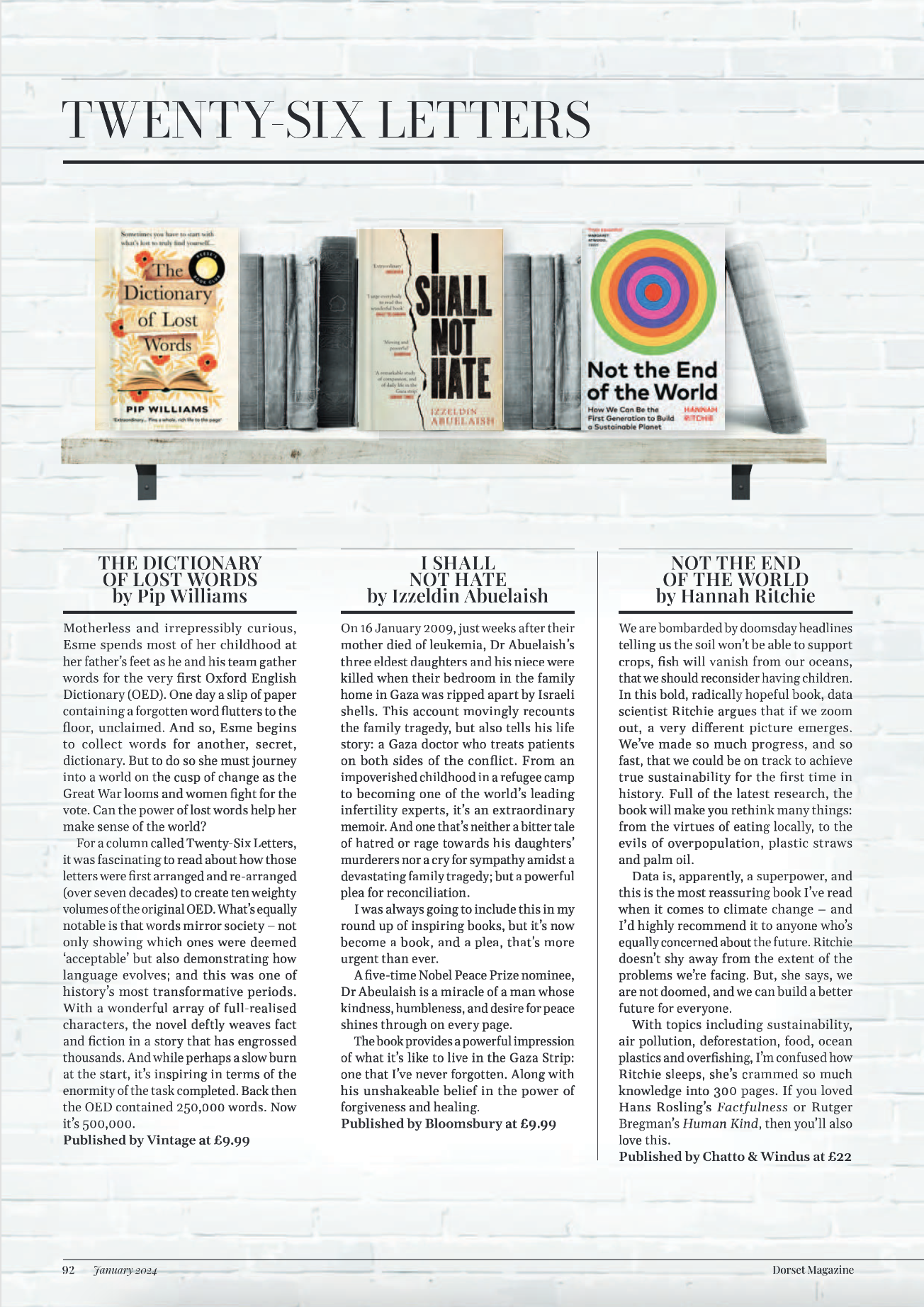 Twenty-six Letters: January 2024 Posted byJess MorencyJanuary 4, 2024January 4, 2024Posted inbook reviews, Dorset MagazineTags:andrew solomon, far from the tree, greenlights, hannah ritchie, i shall not hate, inspirational reading, Izzeldin Abuelaish, matthew mcconaughey, not the end of the world, the dictionary of lost words, wintering Share this: Click to share on X (Opens in new window) X Click to share on Facebook (Opens in new window) Facebook Like Loading... Related Published by Jess Morency Feature writer, teacher and brand consultant View more posts