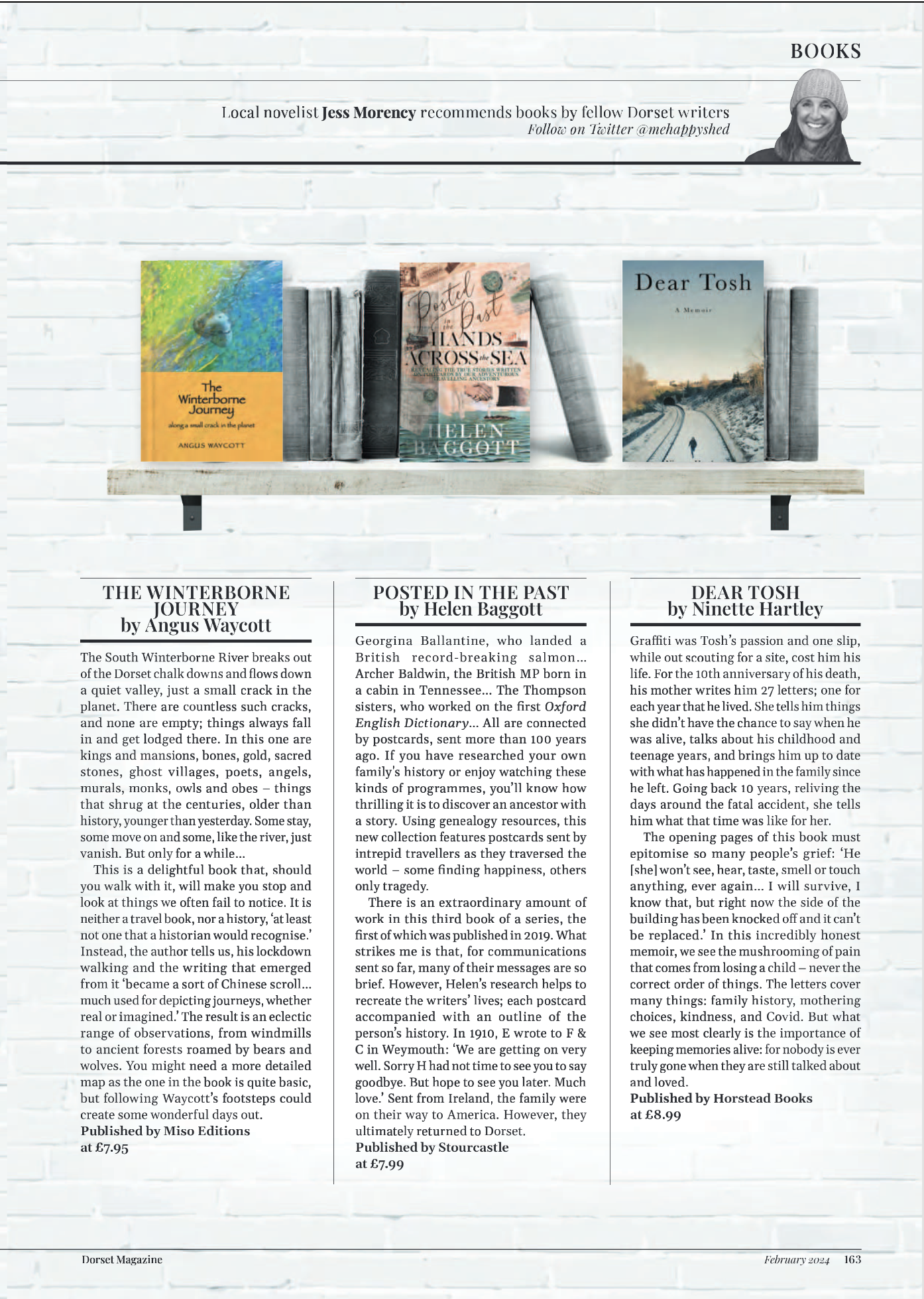 Twenty-six Letters: February 2023 Posted byJess MorencyJanuary 21, 2024Posted inbook reviews, Dorset MagazineTags:Chesil Beach, Dear Tosh, Hands Across the Sea, The Charity Shop Detective Agency, The Secret Life of Carolyn Russell, The Winterborne Journey Share this: Click to share on X (Opens in new window) X Click to share on Facebook (Opens in new window) Facebook Like Loading... Related Published by Jess Morency Feature writer, teacher and brand consultant View more posts