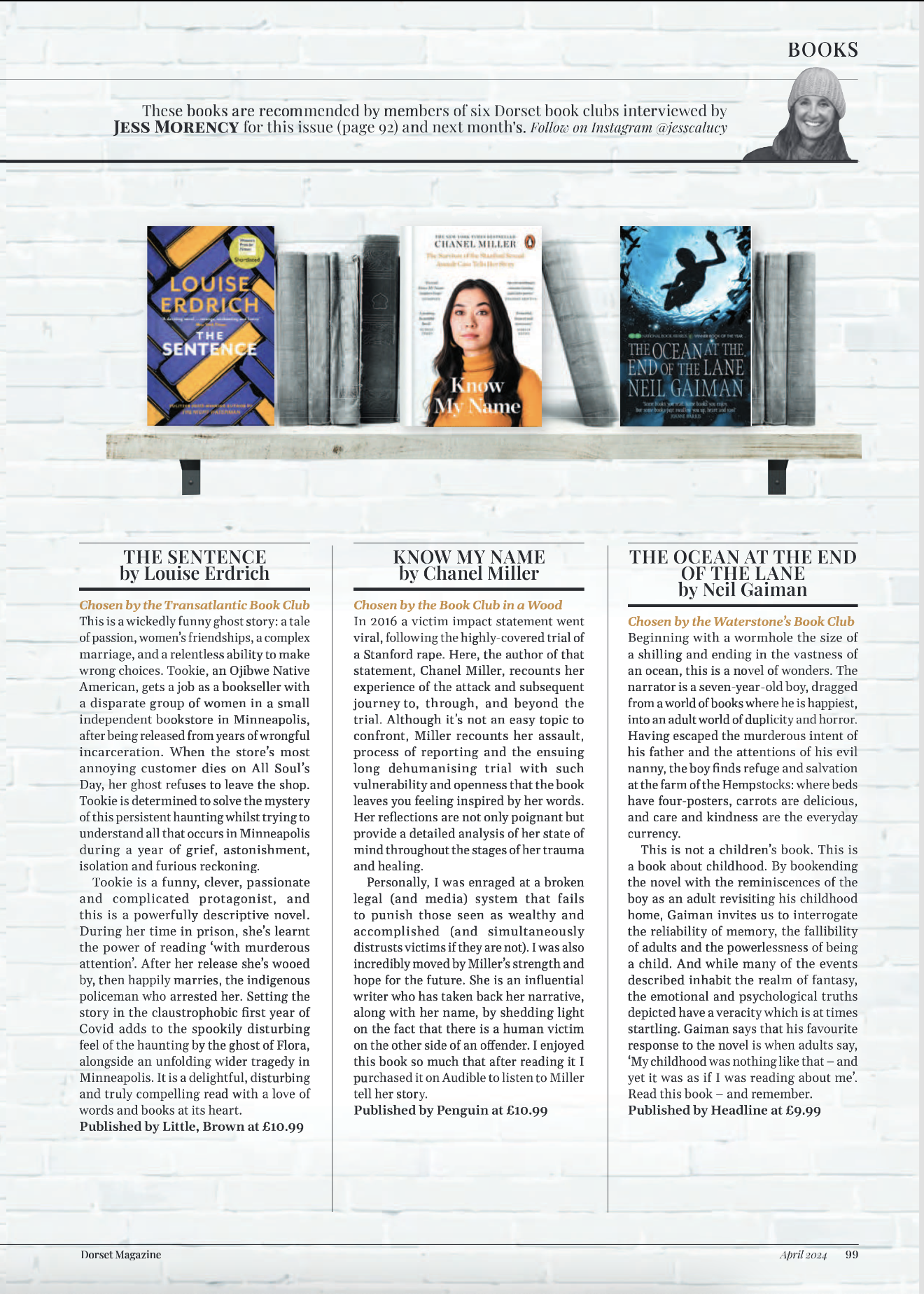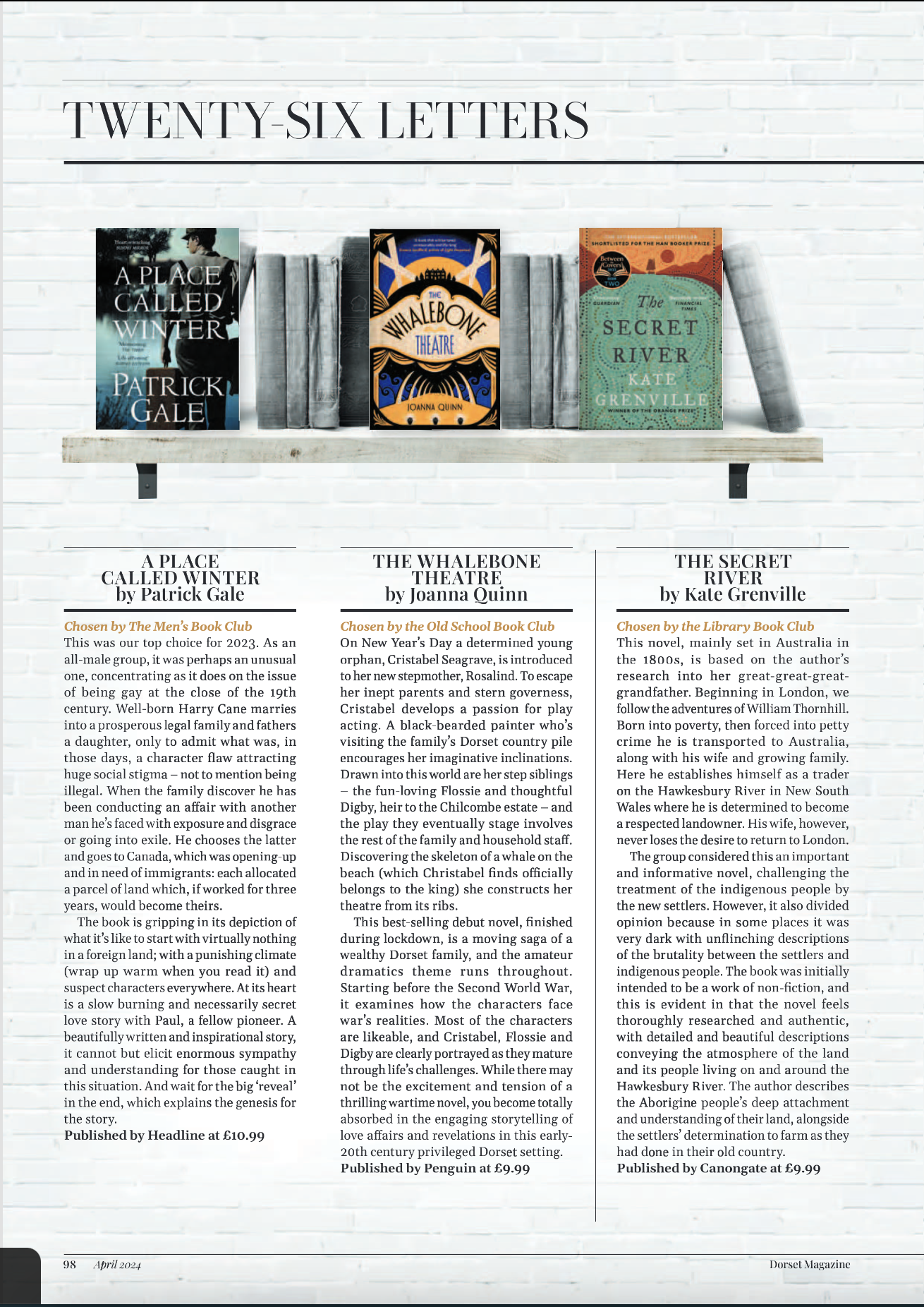 Twenty-six Letters: April Posted byJess MorencyApril 8, 2024Posted inbook reviews, Dorset MagazineTags:A Place Called Winter, Book Club recommendations, book clubs, Dorset readers, Know My Name, The Ocean at the End of the Lane, The Secret River, The Sentence, The Whalebone Theatre Share this: Click to share on X (Opens in new window) X Click to share on Facebook (Opens in new window) Facebook Like Loading... Related Published by Jess Morency Feature writer, teacher and brand consultant View more posts