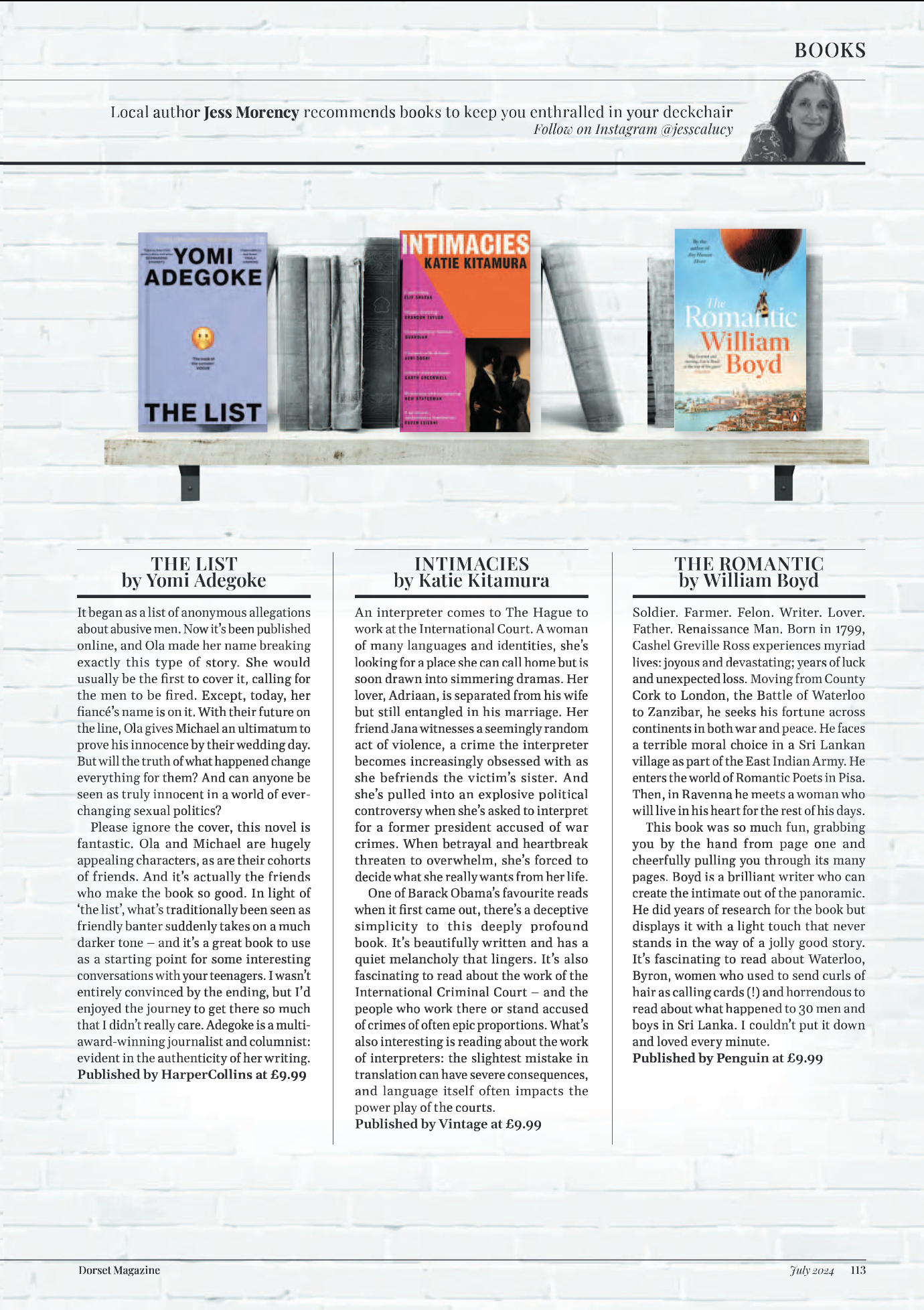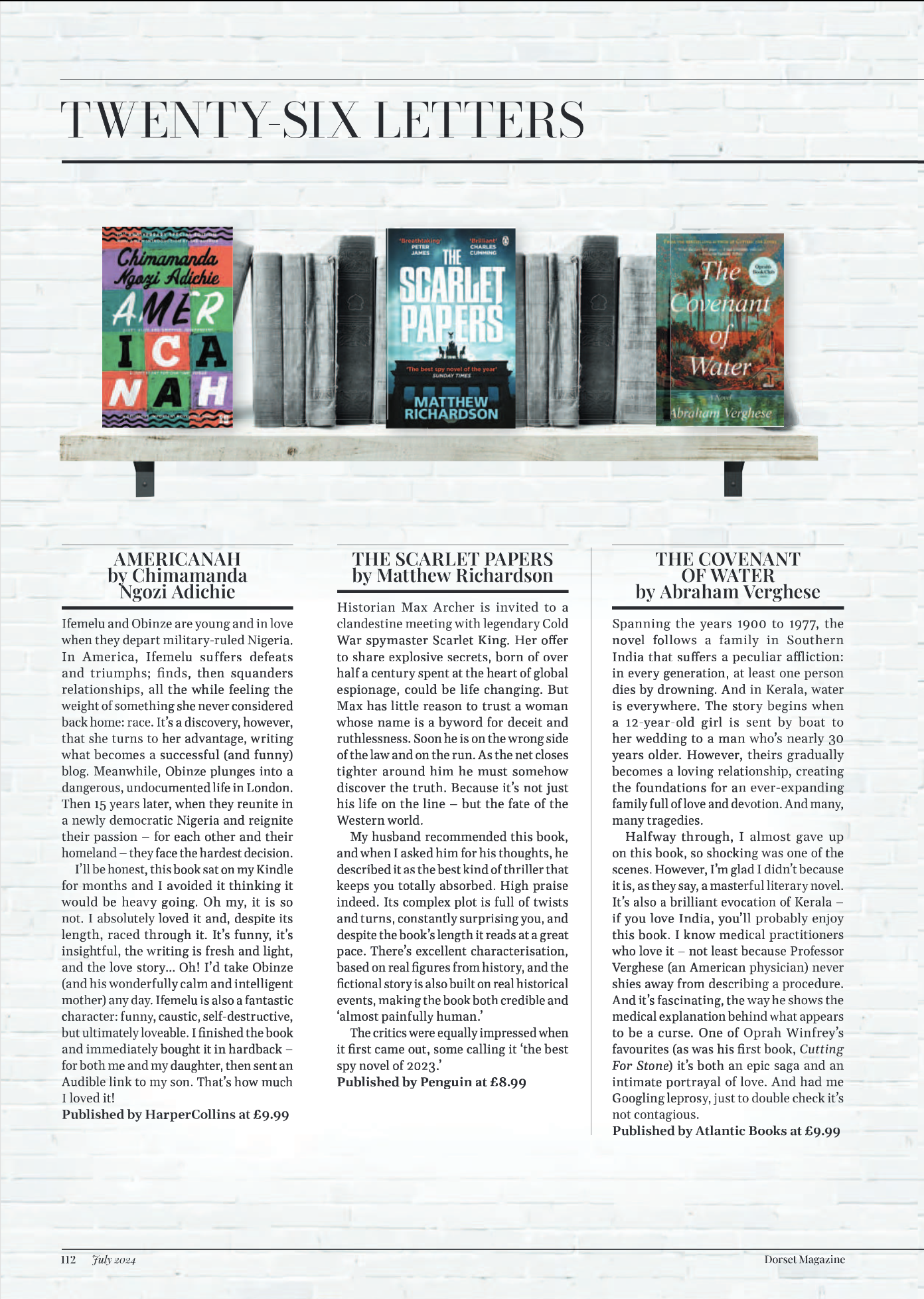 Twenty-Six Letters: July Posted byJess MorencyJuly 1, 2024Posted inbook reviews, Dorset MagazineTags:abrahamverghese, americanah, Bookbub, bookreviews, chimamandangoziadichie, dorsetmagazine, intimacies, katiekitamura, Thecovenantofwater, thescarletpapers, williamboyd, yomiadegoke Share this: Share on X (Opens in new window) X Share on Facebook (Opens in new window) Facebook Like Loading... Related Published by Jess Morency Feature writer, teacher and brand consultant View more posts